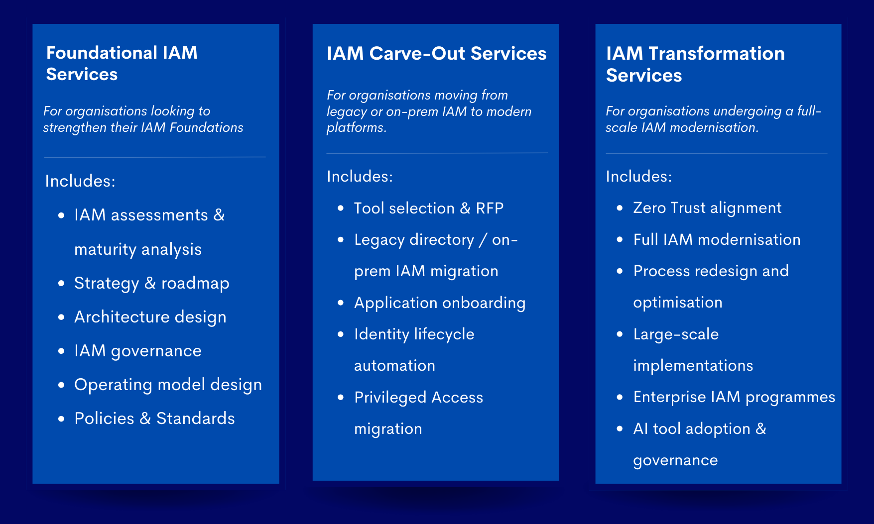 With over 20 years of enterprise IAM delivery experience, our team brings proven, hands-on expertise across Identity and Access Governance (IGA), Privileged Access Management (PAM), AI and agentic security, and large-scale transformation programs.